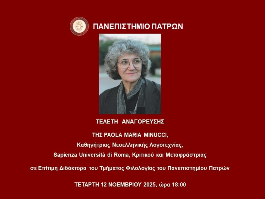 Η Paola Maria Minucci, Καθηγήτρια Νεοελληνικής Λογοτεχνίας, Sapienza Università di Roma, Kριτικός και Mεταφράστρια θα αναγορευθεί Επίτιμη Διδάκτορας του Τμήματος Φιλολογίας του Πανεπιστημίου Πατρών, την Τετάρτη 12 Νοεμβρίου 2025 και ώρα 18:00 στην Αίθουσα Τελετών «Οδυσσέας Ελύτης». Το έργο και την προσωπικότητα της τιμώμενης θα παρουσιάσει η Καθηγήτρια Κατερίνα Ε. Κωστίου, ενώ θα ακολουθήσει η αναγόρευση της τιμώμενης σε Επίτιμη Διδάκτορα του Τμήματος Φιλολογίας από τον Πρόεδρο του Τμήματος, Καθηγητή Ιωάννη Π. Παπαθεοδώρου. Η περιένδυση της τιμώμενης θα πραγματοποιηθεί από τον Πρύτανη του Πανεπιστημίου, Καθηγητή Χρήστο Μπούρα. Η εκδήλωση της επιτιμοποίησης θα ολοκληρωθεί με την ομιλία της Paola Maria Minucci “Η ιδιωτική οδός του Οδυσσέα Ελύτη”