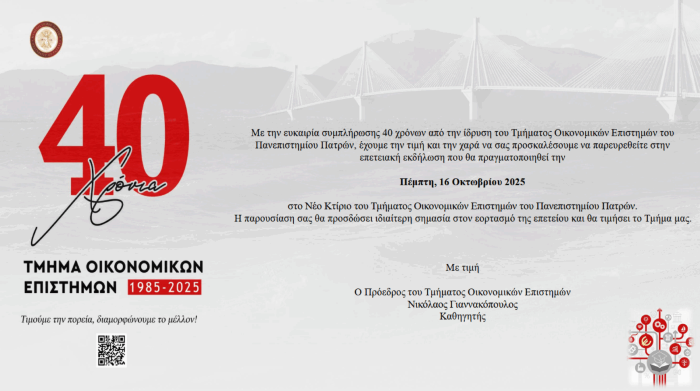 Για τον εορτασμό αυτού του ορόσημου θα πραγματοποιηθεί εκδήλωση την Πέμπτη, 16 Οκτωβρίου, 2025 στο Νέο Κτήριο Τμήματος Οικονομικών Επιστημών.
