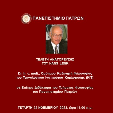 Τελετή Αναγόρευσης του Dr. h. c. mult., Ομότιμου Καθηγητή Φιλοσοφίας του Τεχνολογικού Ινστιτούτου Καρλσρούης (ΚΙΤ) Hans Lenk, σε Επίτιμο Διδάκτορα | 22.11.2023