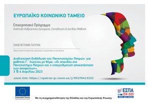 Για Τρίτη συνεχόμενη χρονιά το Τμήμα Υποστήριξης Φοιτητών, Απασχόλησης, Σταδιοδρομίας και Διασύνδεσης, της Διεύθυνσης Εκπαίδευσης και Έρευνας, στο πλαίσιο της Πράξης «Γραφείο Διασύνδεσης Πανεπιστημίου Πατρών», με Επιστημονικό Υπεύθυνο τον Καθηγητή κ. Δημήτριο Μούρτζη, email: mourtzis@lms.mech.upatras.gr διοργανώνει Ενημερωτική Εκδήλωση στις 3 και 4 Απριλίου 2023, για μαθητές Γ΄ Λυκείου με θέμα: «Οι σπουδές στο Πανεπιστήμιο Πατρών και η επαγγελματική αποκατάσταση των αποφοίτων».
