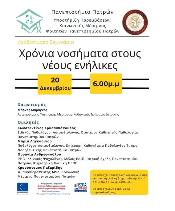 Η Κοινωνική Μέριμνα διοργανώνει στις 20 Δεκεμβρίου και ώρα 6 μ.μ. ενημερωτικό διαδικτυακό σεμινάριο με θέμα “Χρόνια νοσήματα στους νέους ενήλικες”.