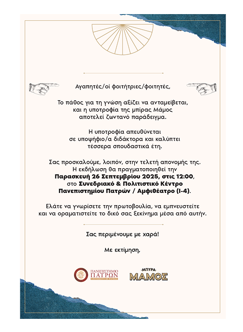 Την Παρασκευή 26.09.2025 και ώρα 12.00, στο Συνεδριακό και Πολιτιστικό Κέντρο του Πανεπιστημίου Πατρών, θα πραγματοποιηθεί εκδήλωση της επίσημης παρουσίασης της Υποτροφίας «ΜΑΜΟΣ» προσφορά της Αθηναϊκής Ζυθοποιίας Α.Ε.