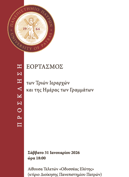 Το Πανεπιστήμιο Πατρών διοργανώνει τον καθιερωμένο Εορτασμό των Τριών Ιεραρχών και της Ημέρας των Γραμμάτων, το Σάββατο 31 Ιανουαρίου 2026 και ώρα 18:00, στην Αίθουσα Τελετών «Οδυσσέας Ελύτης» του Πανεπιστημίου Πατρών.