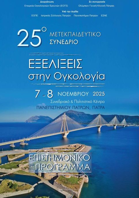 Ανακοινώνεται ότι το 25ο Συνέδριο με διεθνή συμμετοχή «ΕΞΕΛΙΞΕΙΣ ΣΤΗΝ ΟΓΚΟΛΟΓΙΑ» θα πραγματοποιηθεί στις 7 και 8 Νοεμβρίου 2025, στο Συνεδριακό & Πολιτιστικό Κέντρο του Πανεπιστημίου Πατρών (έναρξη: Παρασκευή, 7/11/25, ώρα: 9.00 π.μ.).