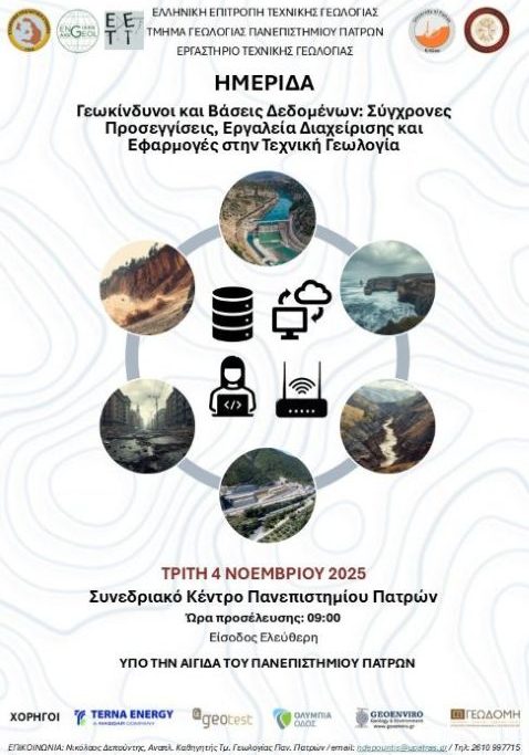 “Γεωκίνδυνοι και Βάσεις Δεδομένων: Σύγχρονες Προσεγγίσεις, Εργαλεία Διαχείρισης και Εφαρμογές στην Τεχνική Γεωλογία”.Η ημερίδα θα πραγματοποιηθεί την Τρίτη 4 Νοεμβρίου 2025 στο Συνεδριακό Κέντρο του Πανεπιστημίου Πατρών.