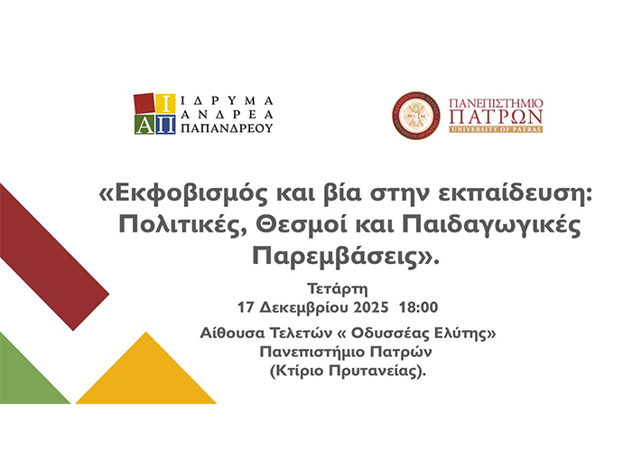 Την Τετάρτη 17 Δεκεμβρίου 2025 και ώρα 18:00, στην Αίθουσα Τελετών « Οδυσσέας Ελύτης» του Πανεπιστημίου Πατρών, το Ίδρυμα Ανδρέα Παπανδρέου σε συνεργασία με το Πανεπιστήμιο Πατρών, διοργανώνουν ημερίδα με θέμα: “Εκφοβισμός και βία στην Εκπαίδευση: Πολιτικές, Θεσμοί και Παιδαγωγικές Παρεμβάσεις”.