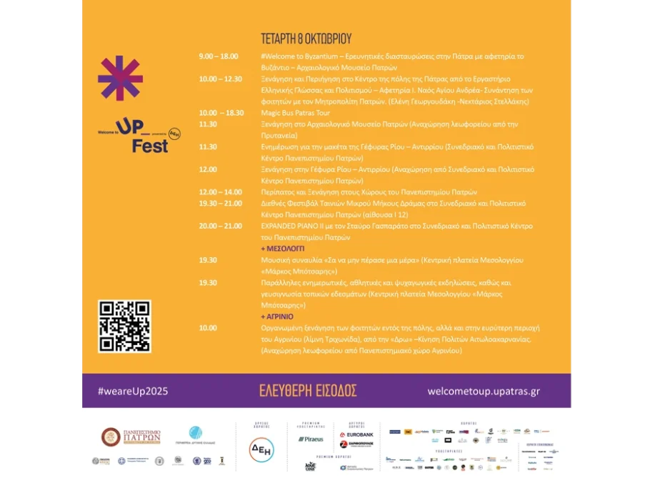 To Welcome to UP 2025 powered by ΔΕΗ διοργανώνεται, από το Πανεπιστήμιο Πατρών, σε συνδιοργάνωση με την Περιφέρεια Δυτικής Ελλάδας και το Επιμελητήριο Αχαΐας, σε συνεργασία με τους Δήμους Πατρέων, Αγρινίου και Μεσολογγίου και με τη στήριξη του Υπουργείου Πολιτισμού.
