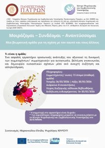 Το Κέντρο Ψυχολογικής και Συμβουλευτικής Υποστήριξης του Πανεπιστημίου Πατρών (ΚΕΨΥΣΥΠ), στο πλαίσιο υλοποίησης του ΥΕ2 με τίτλο: «Υπηρεσίες Κέντρου Ψυχολογικής και Συμβουλευτικής Υποστήριξης Πανεπιστημίου Πατρών», Φ.Κ. 83955 της Πράξης με τίτλο: «Δράσεις ενδυνάμωσης και προώθησης της ισότητας στα ΑΕΙ και υποστήριξη Κέντρου Ψυχολογικής και Συμβουλευτικής Υποστήριξης Πανεπιστημίου Πατρών» με Κωδικό ΟΠΣ 6018935, που συγχρηματοδοτείται από Ευρωπαϊκούς (Ευρωπαϊκό Κοινωνικό Ταμείο) και Εθνικούς Πόρους μέσω του Ε.Π. «Ανθρώπινο Δυναμικό και Κοινωνική Συνοχή 2021–2027», με Επιστημονική Υπεύθυνη την Αντιπρύτανι Φοιτητικής Μέριμνας και Πολιτισμού, Ελένη Αλμπάνη, Αναπληρώτρια Καθηγήτρια, διοργανώνει πρόγραμμα ομαδικής συμβουλευτικής κατά τη διάρκεια του εαρινού εξαμήνου με τίτλο «Μοιράζομαι – Συνδέομαι- Αναπτύσσομαι: Μια βιωματική ομάδα για τη σχέση με τον εαυτό και τους άλλους».
