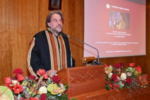 «Σεβασμιώτατε, η πανεπιστημιακή μας κοινότητα σας υποδέχεται με ιδιαίτερο σεβασμό και εκτίμηση. Με τη σημερινή τελετή τιμούμε έναν διακεκριμένο ιεράρχη, έναν θεολόγο και πανεπιστημιακό διδάσκαλο, ο οποίος έχει αφιερώσει τη ζωή του στη διακονία της Εκκλησίας, της γνώσης και στην προαγωγή της ανθρώπινης αξιοπρέπειας. Η παρουσία σας ανάμεσά μας υπενθυμίζει ότι η γνώση, όταν συνοδεύεται από προσήνεια, πνευματικότητα και κοινωνική ευαισθησία, δύναται να λειτουργήσει ως καταλύτης προόδου και δημιουργικής συνεισφοράς. Η αναγόρευσή σας σε Επίτιμο Διδάκτορα του Τμήματος Διοικητικής Επιστήμης και Τεχνολογίας αποτελεί αναγνώριση της συμβολής σας στην προώθηση της προσφοράς, του διαλόγου, της γνώσης και της οικουμενικότητας – θεμελιωδών αξιών που διέπουν το ακαδημαϊκό μας έργο.»