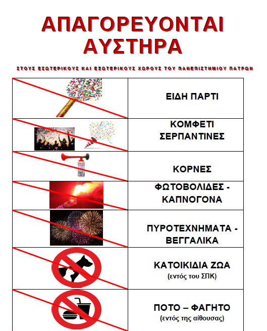 Στους χώρους διεξαγωγής των τελετών, θα πραγματοποιείται λήψη φωτογραφιών/βίντεο, πώληση άνθεων, πώληση αναμνηστικών ειδών – δώρων με το λογότυπο του Πανεπιστημίου Πατρών από αδειοδοτημένους επαγγελματίες.
