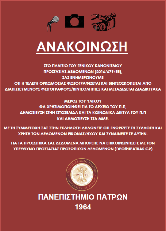 Στο πλαίσιο του Γενικού Κανονισμού Προστασίας Προσωπικών Δεδομένων ΕΕ 2016/679, σας ενημερώνουμε ότι, οι τελετές ορκωμοσίας πτυχιούχων – διπλωματούχων του Πανεπιστημίου Πατρών, μεταδίδονται διαδικτυακά. Οι σύνδεσμοι διαδικτυακής μετάδοσης είναι ενεργοί για τη ζωντανή αναμετάδοση των τελετών. Οι τελετές βιντεοσκοπούνται, ενώ καθ’ όλη τη διάρκεια τους λαμβάνονται φωτογραφίες των ορκιζόμενων και λοιπών παρευρισκόμενων από διαπιστευμένους φωτογράφους, εικονολήπτες. Μέρος του υλικού ενδέχεται να χρησιμοποιηθεί για το αρχείο του Π.Π, δημοσίευση στην ιστοσελίδα και τα κοινωνικά δίκτυα του Π.Π. και δημοσίευση στα ΜΜΕ. Με τη συμμετοχή σας στις τελετές δηλώνετε ότι γνωρίζετε τη συλλογή και χρήση των δεδομένων εικόνας/ήχου και συναινείτε σε αυτήν. Όποιος ή όποια δεν αποδέχεται την πιθανότητα να φωτογραφηθεί ή βιντεοσκοπηθεί, παρακαλούμε να το δηλώσει στο (panen@upatras.gr), προκειμένου να κατευθυνθεί σε θέσεις εκτός εμβέλειας της φωτογράφησης ή της βιντεοσκόπησης. Ο αριθμός των θέσεων είναι περιορισμένος και θα τηρηθεί σειρά χρονικής προτεραιότητας. Πληροφορίες σχετικά με την Προστασία Προσωπικών Δεδομένων μπορείτε να αναζητήσετε στο σύνδεσμο: https://www.upatras.gr/privacy-policy/ https://dpo.upatras.gr/ ή να επικοινωνήσετε με τον Υπεύθυνο Προστασίας Δεδομένων (dpo@upatras.gr).