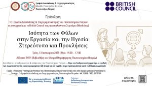Στο πλαίσιο της Πράξης «Υπηρεσίες Υποστήριξης Φοιτητών του Πανεπιστημίου Πατρών στην ένταξή τους στην αγορά εργασίας» με Κωδικό ΟΠΣ 6018184 στη Δράση του Προγράμματος «Ανθρώπινο Δυναμικό και Κοινωνική Συνοχή 2021-2027», το Γραφείο Διασύνδεσης & Επιχειρηματικότητας, της Μονάδας Υποστήριξης Φοιτητών (Μ.Υ.Φ.) του Πανεπιστημίου Πατρών, σε συνεργασία με το Βρετανικό Συμβούλιο (British Council) πραγματοποιεί Σεμινάριο (workshop), την Τρίτη 13 Ιανουαρίου 2026 και ώρα 14.00 – 17.00, στην Αίθουσα ΒΥΠ1, Βιβλιοθήκη & Κέντρο Πληροφόρησης Πανεπιστημίου Πατρών, με θέμα: «Ισότητα των Φύλων στην Εργασία και την Ηγεσία: Στερεότυπα και Προκλήσεις»».