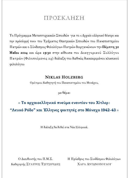 Το Πρόγραμμα Μεταπτυχιακών Σπουδών για το «Αρχαίο ελληνικό θέατρο και την πρόσληψή του» του Τμήματος Θεατρικών Σπουδών του Πανεπιστημίου Πατρών και ο Σύνδεσμος Φιλολόγων Πατρών διοργανώνουν την Πέμπτη, 30 Μάϊ 2024 και ώρα 19:30 στην αίθουσα του Δικηγορικού Συλλόγου Πατρών (Φιλοποιμενος 24) διάλεξη του διεθνώς διακεκριμένου κλασικού φιλολόγου NIKLAS HOLZBERG, Ομότιμου Καθηγητή του Πανεπιστημίου του Μονάχου με θέμα: