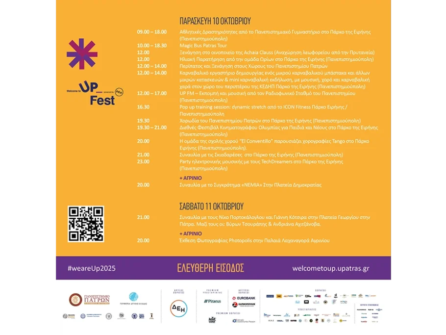 Η Παρασκευή 10 Οκτωβρίου σηματοδοτεί την προτελευταία μέρα του Welcome to UP 2025 powered by ΔΕΗ, και το κέφι στο Πανεπιστήμιο Πατρών χτυπάει… κόκκινο! Μία μέρα γεμάτη δράση, μουσική, δημιουργία και περιπέτεια περιμένει φοιτητές και επισκέπτες στην Πανεπιστημιούπολη της Πάτρας αλλά και στο Αγρίνιο.