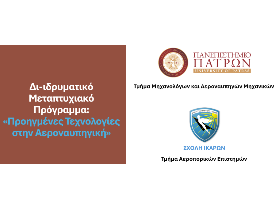 Το νέο Διϊδρυματικό Μεταπτυχιακό Πρόγραμμα Σπουδών «Προηγμένες Τεχνολογίες στην Αεροναυπηγική» (Advanced Technologies in Aeronautics) το οποίο προσφέρεται από το Τμήμα Μηχανολόγων & Αεροναυπηγών Μηχανικών του Πανεπιστημίου Πατρών και το Τμήμα Αεροπορικών Σπουδών της Σχολής Ικάρων, προκηρύσσει για το ακαδημαϊκό έτος 2025-2026, πενήντα (50) θέσεις μεταπτυχιακών φοιτητών.